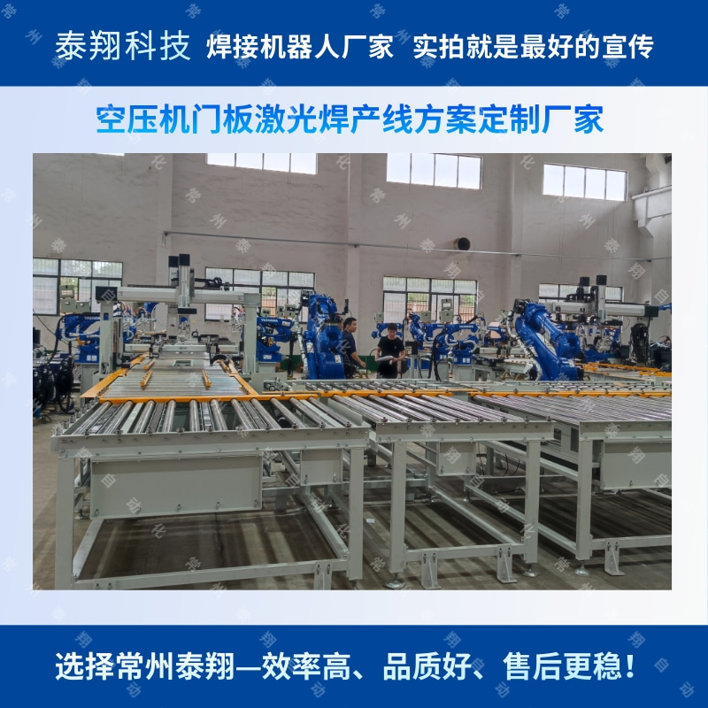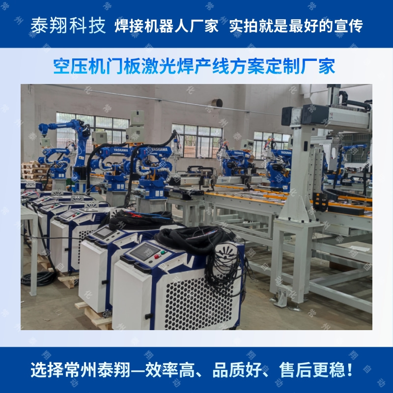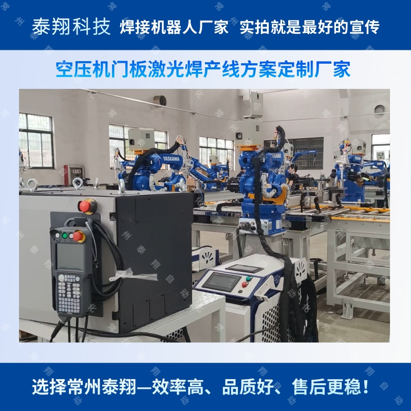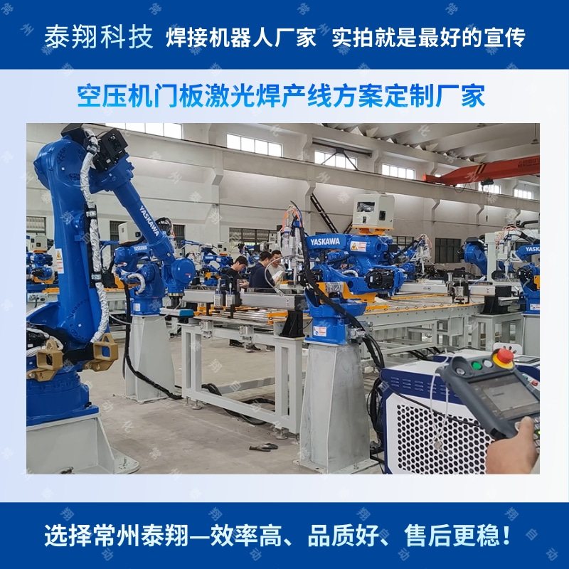常州泰翔自动化公司为客户定制的空压机自动化焊接生产线,采用输送线式机器人自动上下料,多位置激光焊接机器人焊接,更多案例详情,欢迎咨询~