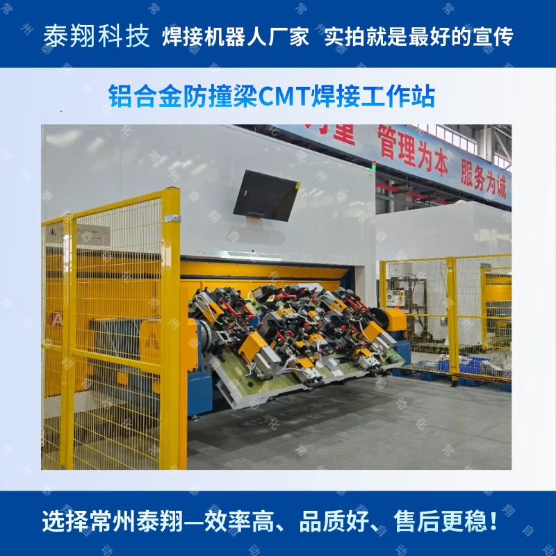 常州泰翔自动化公司的铝合金防撞梁CMT焊接工作站是一套高效、精确的焊接解决方案,专为铝合金材料的焊接而设计。该工作站采用了发那科焊接机器人,配备双枪焊接系统,能够实现高质量的焊接效果,确保焊缝均匀且强度高。